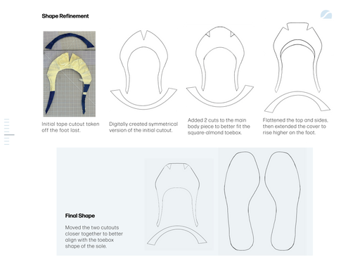 Through testing, I developed a flattened upper template and added two triangular notches instead of one, allowing the felt to wrap smoothly around the square toe and improve fit.
